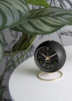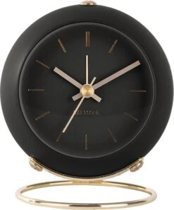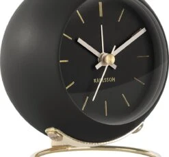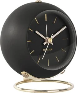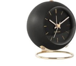 Globe wekker van Karlsson. Chique wekker in het zwart, met goudkleurige details op de wijzerplaat. Door de ronde vorm en goudkleurige voet heeft de Globe wekker een klassieke, stijlvolle uitstraling. Het is een eyecatcher op je nachtkastje! Wekker Globe werkt op 1 AA-batterij (niet inbegrepen). Afmeting: 10,5 x 7 x 9 centimeter.