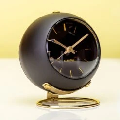 Globe wekker van Karlsson. Chique wekker in het zwart, met goudkleurige details op de wijzerplaat. Door de ronde vorm en goudkleurige voet heeft de Globe wekker een klassieke, stijlvolle uitstraling. Het is een eyecatcher op je nachtkastje! Wekker Globe werkt op 1 AA-batterij (niet inbegrepen). Afmeting: 10,5 x 7 x 9 centimeter.