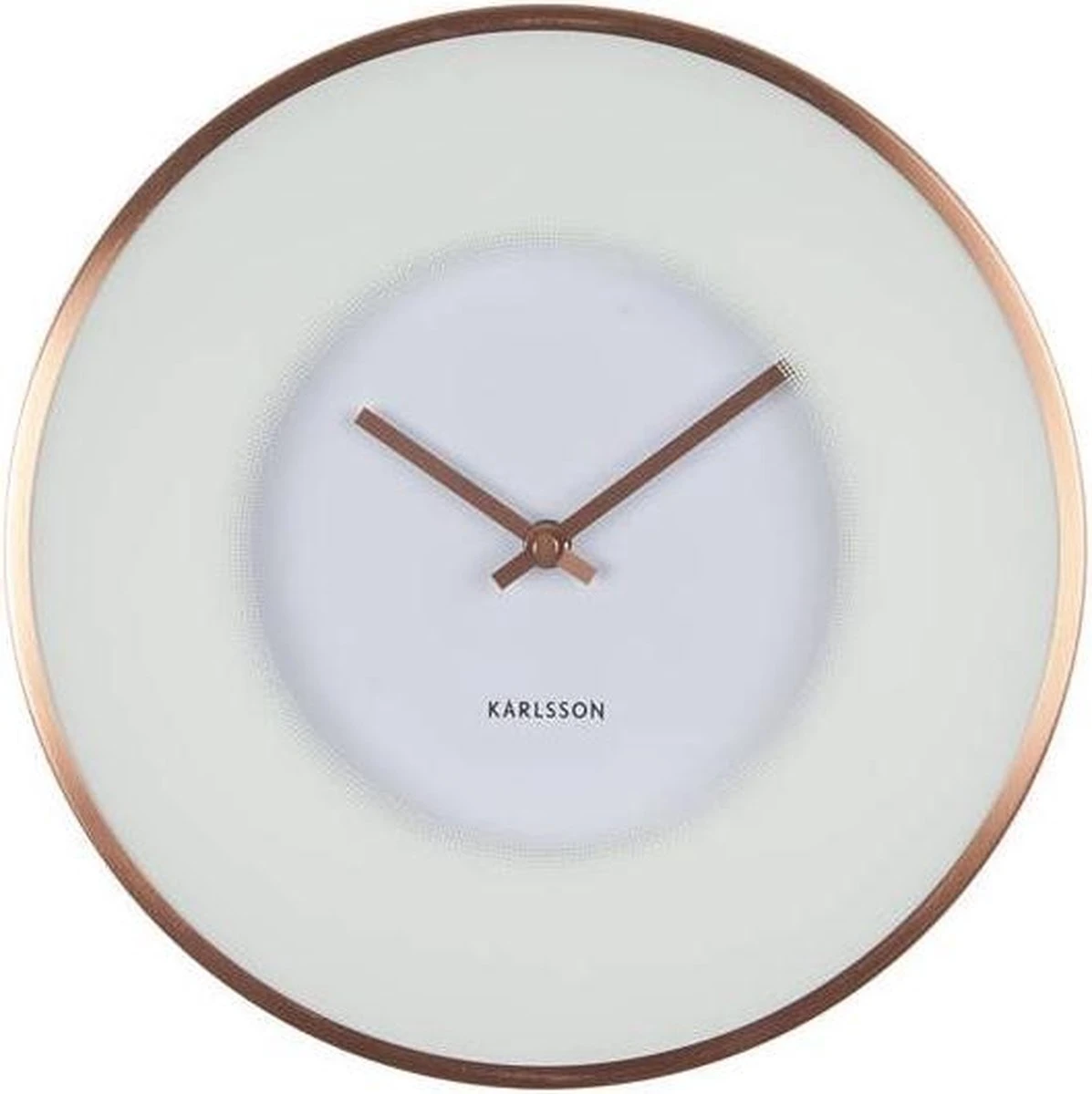 Bij de Karlsson wandklok Illusion is de rand van de glasplaat gebroken wit hierdoor creeer je diepte in het beeld. De glasplaat is aan de buitenrand voorzien van een gebroken witte rand welke aan de binnenkant vervaagt en in het midden transparant is. Het gedeelte waar je door heen kunt kijken heeft een diameter van circa 17 cm. Hieronder zie je de koperkleurige wijzers goed op de witte achtergrond.