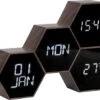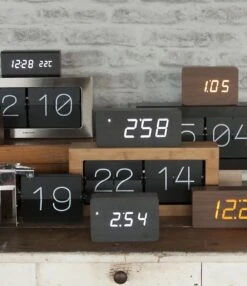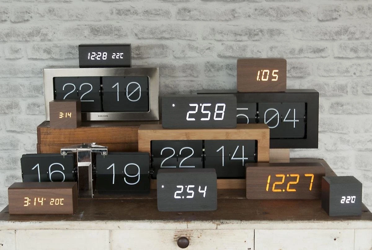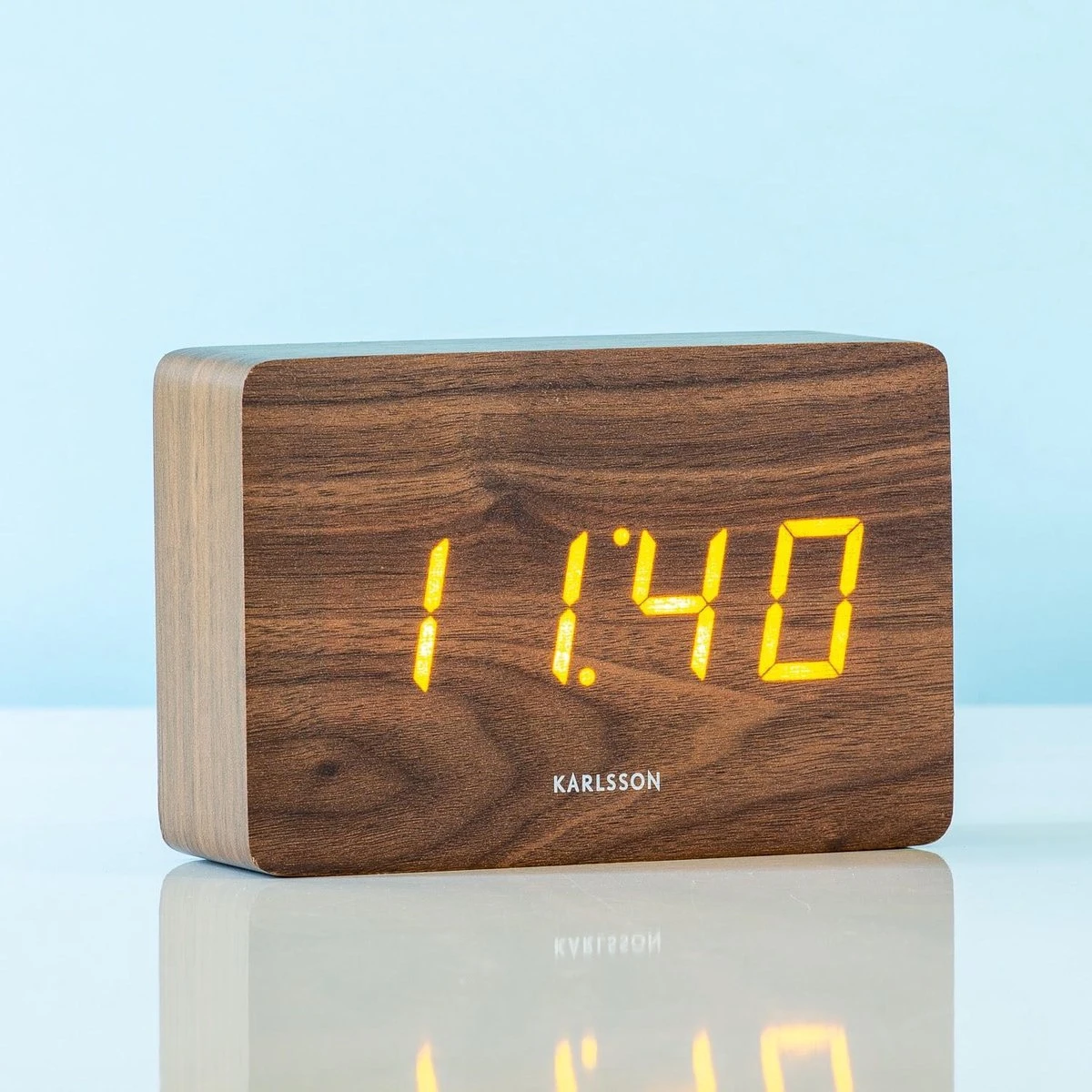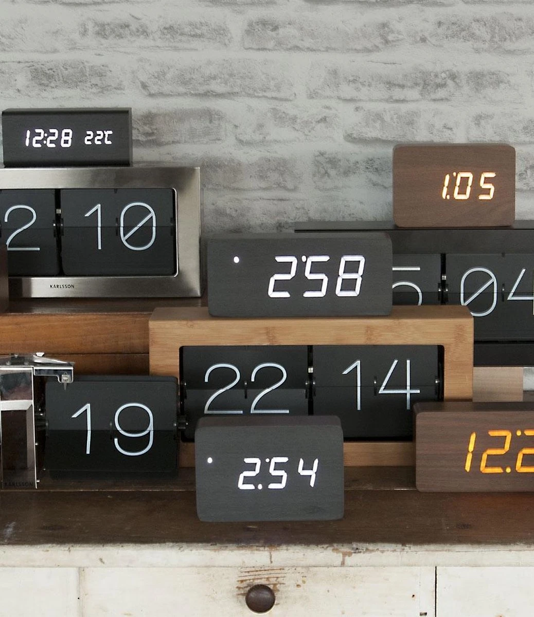 Square wekker van Karlsson. Stijlvolle rechthoekige wekker met houtlook. De wekker lijkt een massief blok hout, maar de bovenste laag bestaat in werkelijkheid uit houtfineer, waar de led-cijfers doorheen schijnen. De bruine wekker heeft witte leds die je kunt activeren door erop te tikken, geluid te maken of je kunt de tijd continu laten zien. De Square wekker werkt op USB (kabel inbegrepen), maar ook op 3 AAA-batterijen (niet inbegrepen). Afmeting: 15 x 10 x 4,8 centimeter.