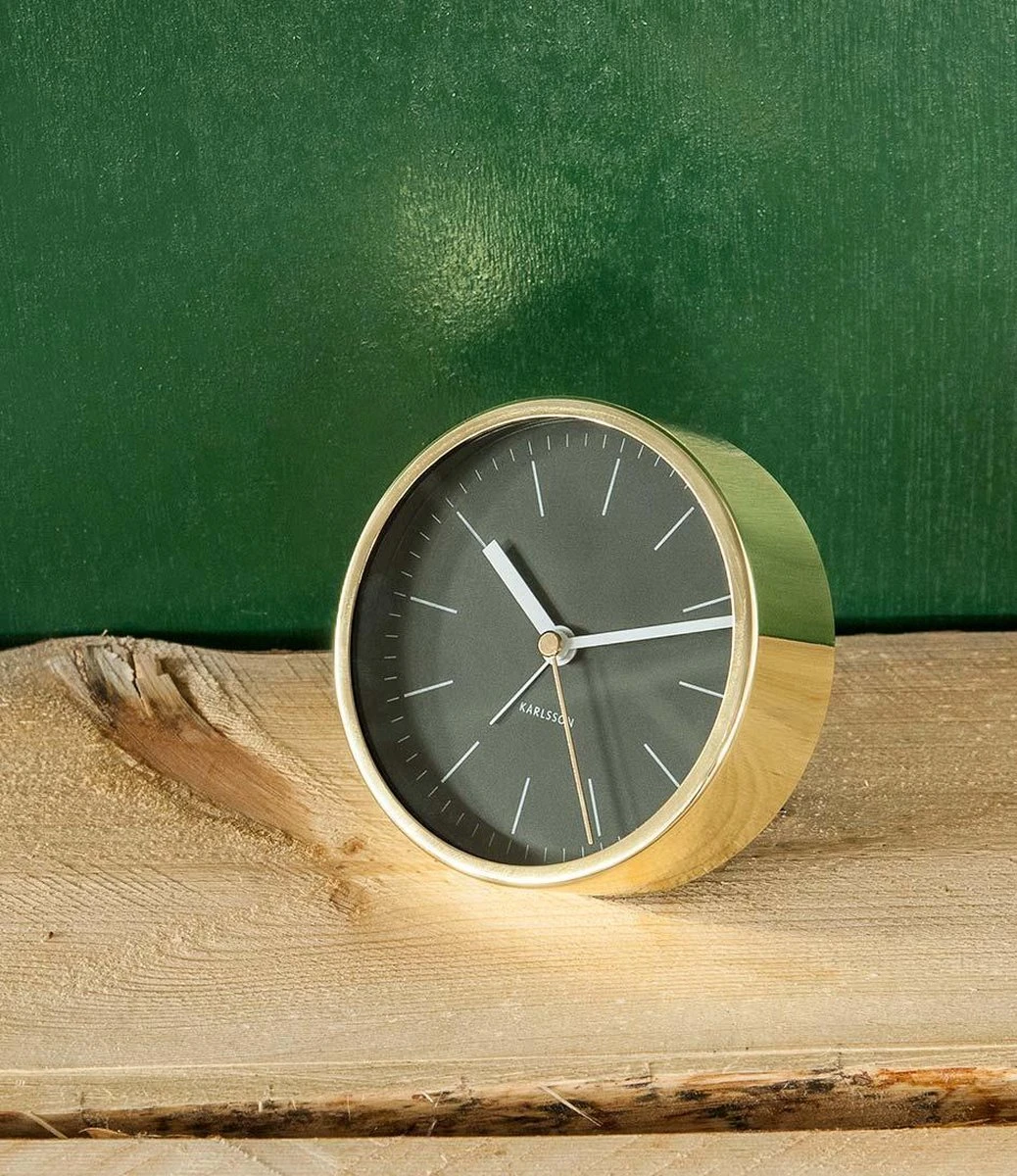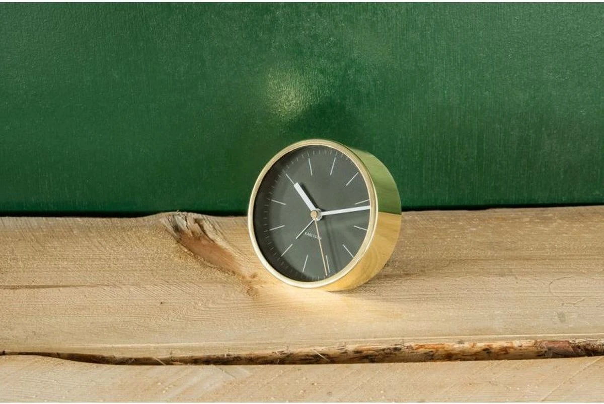 Deze Minimal wekker van Karlsson heeft een goudkleurige metalen rand en een zwarte wijzerplaat. De wekker is voorzien van een wijzerplaat met streepjes welke de uren en de minuten weergeven. Je kunt het klokje neerzetten met het meegeleverde pootje. Aan de achterzijde van het klokje bevinden zich drie knoppen. Één schuifknopje voor het aan en uit zetten van de wekker, één draaiknopje voor het instellen van de wijzers en één voor het in stellen van de alarmtijd. Lekker makkelijk in gebruik.