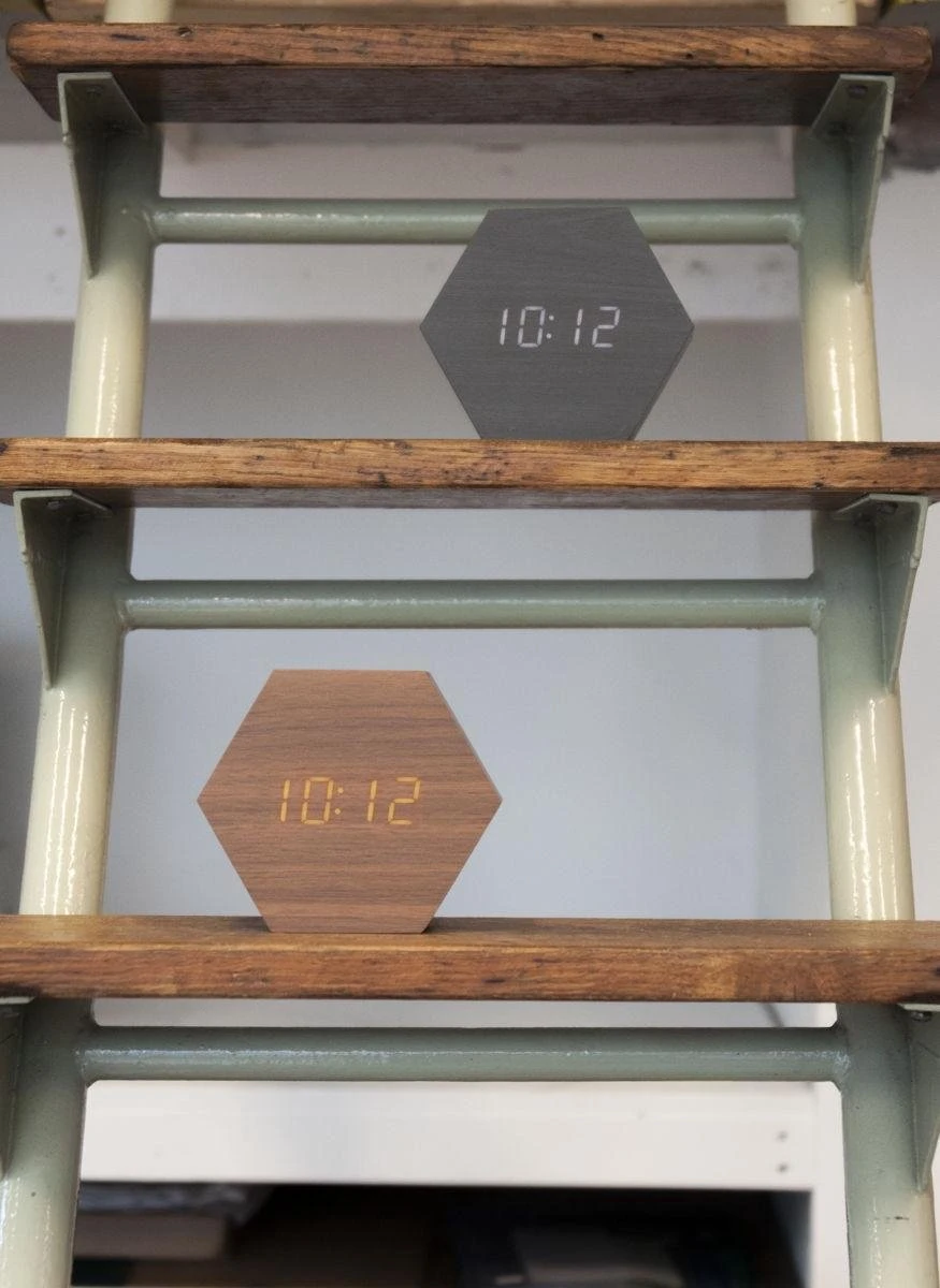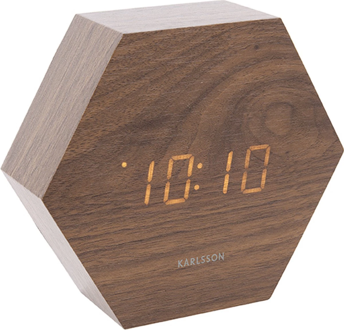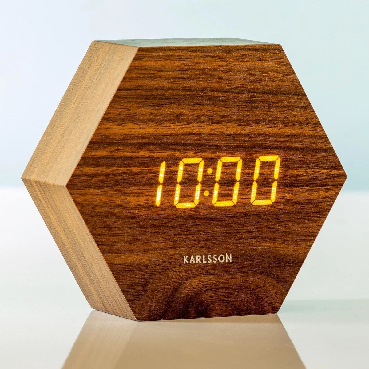 Karlsson – Wekker – Zeshoek – Donker Houtfineer – Witte LED